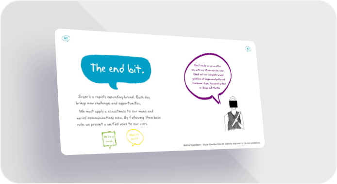 62 63 Don’t make me come after The end bit. you with my 40 cm wooden ruler. Check out our complete brand guidelines at skype.com/go/brand Username: skype, Password: br4nd or Skype me! Malthe Skype is a rapidly expanding brand. Each day brings new challenges and opportunities. We must apply a consistency to our many and varied communications now. By following these basic rules we present a unified voice to our users. Oh I’m so What if I scared. don’t? Malthe Sigurdsson - Skype Creative Director (identity obscured for his own protection).