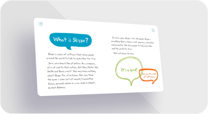 12 13 So once again, Skype is for the people. Skype is What is Skype? everything that a teleco is not: generous, interested and proactive. We allow people to talk each other and the world for free. Skype is a piece of software that allows people That will always be news. around the world to talk to each other for free. Sure, we’ve heard this all before. As a company, we’re all used to that notion. But then Mister Wu, It’s a bird! Smith and Blanc aren’t. They may know nothing about Skype. For all we know, they may think Um, no it’s a bit the name is some sort of sexually transmitted of software. disease, pyramid scheme or a car made in deepest, darkest Bohemia.