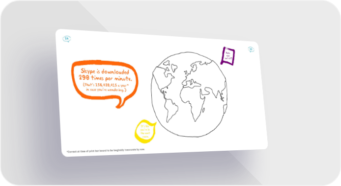 24 25 Yeah, nice isn’t it? Skype is downloaded 298 times per minute. (That’s 156,428,415 a year* in case you’re wondering.) It’s like you’re in the next room. *Correct at time of print but bound to be laughably inaccurate by now.