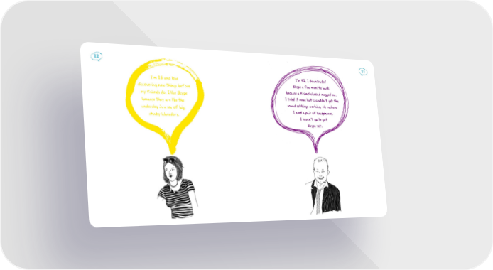 22 23 I’m 42. I downloaded I’m 25 and love Skype a few months back discovering new things before because a friend abroad nagged me. my friends do. I like Skype I tried it once but I couldn’t get the because they are like the sound settings working. He reckons underdog in a sea of big, I need a pair of headphones. stinky labradors. I haven’t quite got Skype yet.