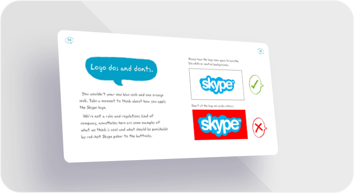 34 35 Always leave the logo some space to breathe. Use white or neutral backgrounds. Logo dos and donts. You wouldn’t wear one blue sock and one orange sock. Take a moment to think about how you apply the Skype logo. Don’t sit the logo on yucky colours. We’re not a rules and regulations kind of company, nonetheless here are some examples of what we think is cool and what should be punishable by red-hot Skype poker to the buttocks.