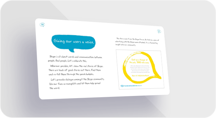 50 51 This story came from the Skype forum. Re-told on a piece of Giving our users a voice. advertising with the Skype name attached, it is a fascinating insight into our community. Skype is all about words and communication between Chat up a stranger at people. Real people. Let’s celebrate this. the pub. 7000 miles away. Wherever possible, let’s show the real stories of Skype. We now have a Skype phone on the bar at the Robbie O’connells Irish Pub in Daytona, Florida. So if you would There are loads of good stories out there. Find them like to talk with our patrons give us a call. But beware, they have been known to solicit pints from people and re-tell them through the speech bubbles. on the internet with homemade signs and pathetic pleas. Skype me! robbieoconnellspub Let’s provoke dialogue amongst the Skype community. Use our fans as evangelists and let them help spread the word.