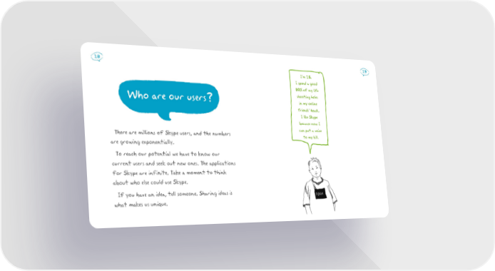 19 18 I’m 16. I spend a good 80% of my life Who are our users? shooting holes in my online friends’ heads. I like Skype because now I There are millions of Skype users, and the numbers can put a voice to my kill. are growing exponentially. To reach our potential we have to know our current users and seek out new ones. The applications for Skype are infinite. Take a moment to think about who else could use Skype. If you have an idea, tell someone. Sharing ideas is what makes us unique.