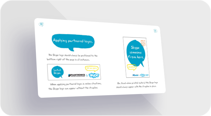 60 61 Even sausage Applying partnered logos. dogs can Skype use it. someone The Skype logo should always be positioned to the from here. bottom right of the page in all instances. Tell me more. anyone. Install Skype. When applying partnered logos in online situations, On stand-alone printed material the Skype logo the Skype logo can appear without the strapline. should always appear with the strapline in place.