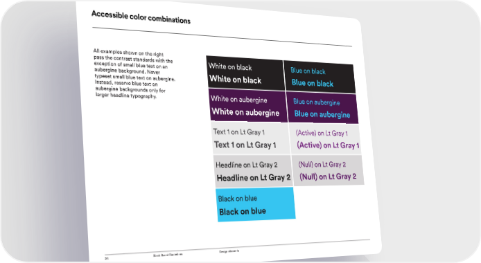 Accessible color combinations All examples shown pass the contrast standards with the exception of small White on black Blue on black blue text on an aubergine background. Never typeset small blue text on White on black Blue on black aubergine. Instead, reserve blue text on aubergine backgrounds only for larger headline typography. White on aubergine Blue on aubergine White on aubergine Blue on aubergine Text 1 on Lt Gray 1 (Active) on Lt. Gray 1 Text 1 on Lt Gray 1 (Active) on Lt. Gray 1 Headline on Lt Gray 2 (Null) on Lt. Gray 2 Headline on Lt Gray 2 (Null) on Lt. Gray 2 Black on blue Black on blue 28 Slack Brand Guidelines Design Elements