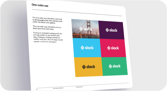 One-color use The one-color logo should be used only on photographs and color backgrounds within the Slack color palette. The one-color logo should only be used in black and white colorways. If using an aubergine background, we strongly prefer to use the full-color logo. However, if design limitations conflict with this, then the logo should appear in white on aubergine. 23 Slack Brand Guidelines Design Elements