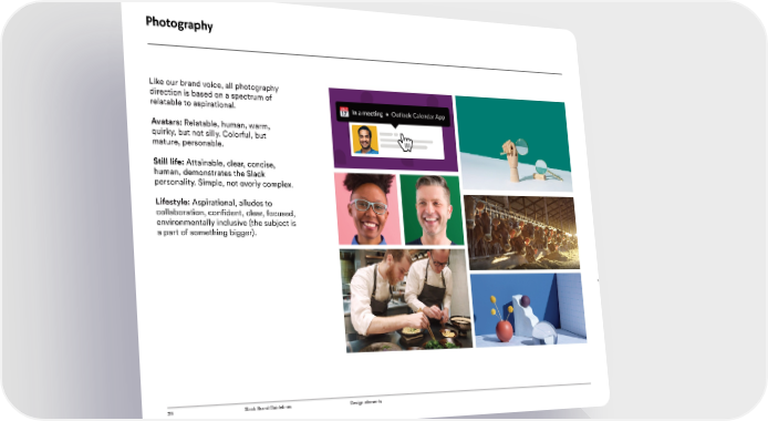Photography Like our brand voice, all photography direction is based on a spectrum of relatable to aspirational. Avatars: Relatable, human, warm, quirky, but not silly, colorful, but mature, personable. Still life: Attainable, clear, concise, human, demonstrates Slack’s personality, simple, not overly complex Lifestyle: Aspirational, alludes to collaboration, confident, clear, focused, environmentally inclusive (the subject is a part of something bigger) 47 Slack Brand Guidelines Design Elements