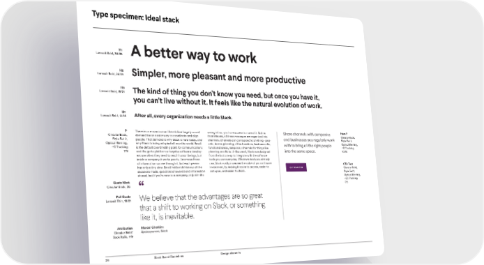 Type specimen: Ideal stack H1 Larsseit Bold, 36/38 A better way to work H2 Larsseit Bold, 24/28 Simpler, more pleasant and more productive H3 Larsseit Bold, 18/21 The kind of thing you don’t know you need, but once you have it, you can’t live without it. It feels like the natural evolution of work. H4 Larsseit Bold, 12/15 After all, every organization needs a little Slack. P There is an enormous and heretofore largely unmet wrong inbox, you have access to none of it. Rather Share channels with companies Hero P Circular Book, demand for an easier way to coordinate and align than inboxes, all those messages are organized into and businesses you regularly work Circular Book, Style Set 2, people. That demand is why Slack is here today, and channels. Channels can correspond to anything - proj- Style Set 2, Optical Kerning, why Slack is being adopted all over the world. Email ects, teams, planning, office locations, business units, with to bring all the right people Optical Kerning, -10 Tracking is the default coordinating point for communications functional areas, temporary channels for things like -10 Tracking 7/9 and the go-to platform enterprise software develop- planning an offsite. Unlike email, Slack was designed into the same room. 10/14 ers use when they need to reach human beings, but from the bottoms-up to integrate with the software inside a company it works poorly. Enormous flows tools you use every day. Whatever tools you already of information course through it, but each person use, Slack vastly increases the value of your software CTA Text has only a tiny view. Email holds rich history: all the investment, by making it easier to access, easier to Circular Bold, decisions made, questions answered and information act upon, and easier to share. Style Set 2, shared, but if you’re new to a company, or just in the Optical Kerning, Quote Mark +20 Tracking Circular Book, 36 “ 7/9 Pull Quote We believe that the advantages are so great Larsseit Thin, 18/21 that a shift to working on Slack, or something like it, is inevitable. Attribution Marcel Gherkins Circular Bold/ Spokesperson, Slack Book Italic, 7/9 31 Slack Brand Guidelines Design Elements