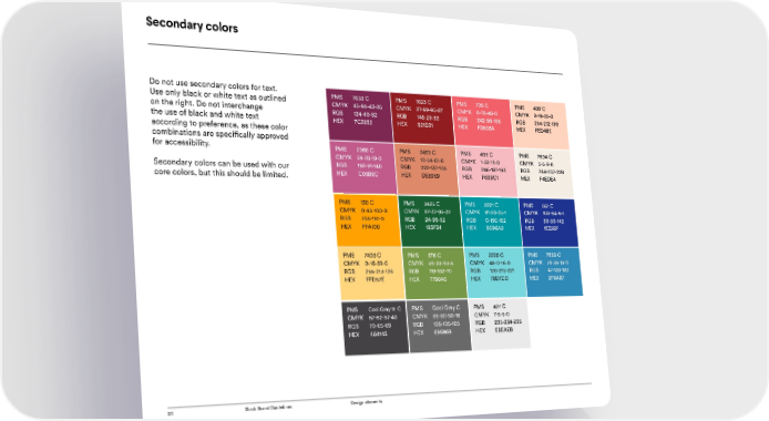 Secondary colors Do not use secondary colors for PMS 7568 C PMS 7623 C PMS 709 C PMS 489 C text. Only use white (#ffffff) or black CMYK 45-94-43-25 CMYK 27-99-95-27 CMYK 0-78-48-0 CMYK 0-19-22-0 (1C1D1C) text over secondary color RGB 124-40-82 RGB 124-40-82 RGB 242-96-106 RGB 254-212-190 backgrounds. HEX 7C2852 HEX 921D21 HEX F2606A HEX FED4BE Use the text pairings above as a guide for accessibility. PMS 2060 C PMS 2439 C PMS 495 C PMS 7604 C CMYK 24-78-19-0 CMYK 10-54-61-0 CMYK 1-32-13-0 CMYK 3-5-9-0 Secondary colors can be used with our RGB 192-91-140 RGB 222-137-105 RGB 246-187-193 RGB 244-237-228 core colors, but this should be limited. HEX C05B8C HEX DE8969 HEX F6BBC1 HEX F4EDE4 PMS 130 C PMS 3425 C PMS 2221 C PMS 661 C CMYK 0-43-100-0 CMYK 87-37-95-32 CMYK 81-23-35-1 CMYK 100-94-9-1 RGB 255-161-0 RGB 24-95-52 RGB 0-150-162 RGB 30-50-143 HEX FFA100 HEX 185F34 HEX 0096A2 HEX 1E328F PMS 7403 C PMS 576 C PMS 2225 C PMS 7689 C CMYK 0-16-59-0 CMYK 59-23-93-5 CMYK 48-0-16-0 CMYK 78-35-13-0 RGB 255-213-126 RGB 119-152-70 RGB 120-215-221 RGB 47-138-183 HEX FFD57E HEX 779846 HEX 78D7DD HEX 2F8AB7 PMS Black 3 C PMS Cool Gray 11 PMS Cool Gray C PMS 427 C CMYK 72-67-64-76 C CMYK 59-50-50-18 CMYK 7-5-5-0 RGB 29-28-29 CMYK 67-62-57-43 RGB 105-105-105 RGB 235-234-235 HEX 1D1C1D RGB 255-255-255 HEX 696969 HEX EBEAEB HEX 464145 26 Slack Brand Guidelines Design Elements