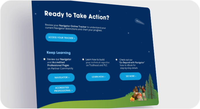 Ready to Take Action? Review your Navigator Online Tracker to understand your current Navigator distinctions and chart your progress. ACCESS YOUR TRACKER > Keep Learning Review our Navigator Learn how to build Check out our and Accredited your technical expertise “Go Beyond with Navigator” Professional Pages on Trailhead and PLC how-to eBook for on Partner Community step-by-step details NAVIGATOR > LEARN HOW > SEE MORE > ACCREDITED PROFESSIONAL >