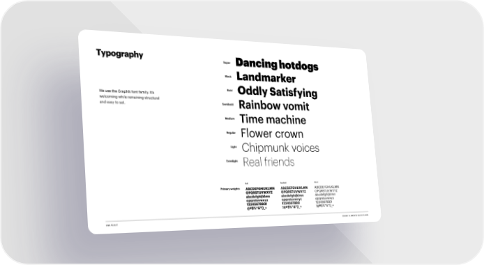 Typography Super Dancing hotdogs Black Landmarker Bold Oddly Satisfying We use the Graphik font family. It’s welcoming while remaining structural and easy to set. Semibold Rainbow vomit Medium Time machine Regular Flower crown Light Chipmunk voices Extralight Real friends Primary weights SNAPCHAT BRAND ELEMENTS QUICK GUIDE