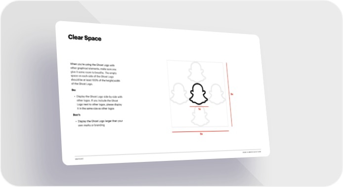 Clear Space When you’re using the Ghost Logo with other graphical elements, make sure you give it some room to breathe. The empty space on each side of the Ghost Logo should be at least 100% of the height/width of the Ghost Logo. Do: 3x • Display the Ghost Logo side-by-side with other logos. If you include the Ghost Logo next to other logos, please display it in the same size as other logos 1x Don’t: • Display the Ghost Logo larger than your own marks or branding 3x SNAPCHAT BRAND ELEMENTS QUICK GUIDE