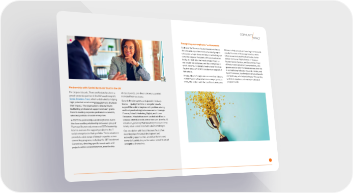 COMMUNITY IMPACT Recognizing our employees’ achievements Each year, the Thomson Reuters Awards celebrates Alliance to help provide pro bono legal services and the extraordinary achievements of a select group of amplify the voices of those oppressed by racism. colleagues who go above and beyond while living our Other winners included Heather Fischer, Senior company purpose. Recipients of these awards acted Advisor for Human Rights Crimes at Thomson boldly and took risks that made a huge impact on Reuters Special Services, and Dave Moran, Head our people, our customers, and the communities in of Product and Consumer Communications, who which we serve. On behalf of each winner Thomson spearheaded an effort to raise awareness for a rise Reuters makes a $10,000 donation to a nonpro昀椀t of in sex traf昀椀cking following the war in Ukraine, and their choice. April Christenson, Vice President of Global Bene昀椀ts Among this year’s eight winners were Dan Calanca, and Wellbeing, who helped bring our Flex My Way a Client Success Consultant on our HighQ product work from anywhere and employee sabbatical team, who worked with the Law Firm Anti-Racism programs to life. Partnership with Social Business Trust in the UK For the past decade, Thomson Reuters has been a of expert panels, and direct advisory support on proud corporate partner of the UK-based nonpro昀椀t individual business issues. Social Business Trust, which is dedicated to helping Several domain experts participated in Advisory high-potential social enterprises grow and increase Boards — giving their time on a regular basis to their impact. The organization achieves this by support the social enterprises with problem-solving facilitating professional support and cash grants and best practice insights in areas such as Strategic from its leading corporate partners in a carefully Finance, Sales & Marketing, Digital, and Human selected portfolio of social enterprises. Resources. A hackathon event was held at of昀椀ces in In 2022 the partnership was strengthened due to London, where 昀椀ve social enterprises were aided by 45 the close working relationship between a group of volunteers, providing their knowledge and experience Thomson Reuters volunteers and SBT’s leadership to help solve several selected business challenges. team to increase the support provided to the 11 Our association with Social Business Trust offers social enterprises in their portfolio. These volunteers meaningful professional development and provided a wide range of domain expertise across networking opportunities, as well as the inherent several key programs, including the SBT Investment reward of contributing to the causes served by social Committee, directing speci昀椀c investments and enterprises themselves. projects within social enterprises, membership 2626
