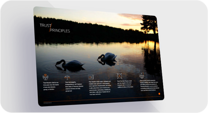 TRUST PRINCIPLES That Reuters shall at no That the integrity, That Reuters shall supply unbiased and That Thomson Reuters shall That no effort shall be spared to time pass into the hands independence, and freedom reliable news services to newspapers, pay due regard to the many expand, develop, and adapt the news of any one interest, from bias of Thomson Reuters news agencies, broadcasters, and other interests which it serves in and other services and products of group, or faction shall at all times be fully media subscribers and to businesses, addition to those of the media Thomson Reuters, so as to maintain preserved governments, institutions, individuals, its leading position in the international and others with whom Reuters has or news and information business may have contracts 5 REUTERS/Dylan Martinez