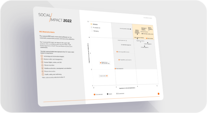 ESG MATERIALITY MATRIX SOCIAL IMPACT 2022 5 Material Business Technology and ethics and Community and social vitality Information transparency Foundational Workforce integrity attraction, Product innovation development, Emerging and retention Human Rights, Justice, and DEI ESG Materiality Matrix Health, safety, and wellbeing Climate transition The material ESG topics were selected based on the 4 materiality assessment process and executive validation. Corporate governance Regulatory compliance Customer engagement The 7 material ESG topics are shown in the upper right Stakeholder engagement quadrant of the materiality matrix demonstrating a high ders Employee engagement level of importance to both Thomson Reuters business and ehol stakeholders. ak t Greenhouse gas (GHG) emissions The light orange shaded area represents the ESG topics rated ernal s3 highest in importance: xt o e 1 Technology and information integrity e t anc t 2 Business ethics and transparency Energy ef昀椀ciency and renewables 3 Human Rights, Justice, and DEI Impor Biodiversity and resource stewardship 4 Climate transition 5 Workforce attraction, development, and retention 2 Waste management 6 Product innovation 7 Health, safety, and well-being *Note: cybersecurity embedded within #1 Circular economy 1 2 3 4 5 Importance to internal stakeholders Environment Social Governance 35