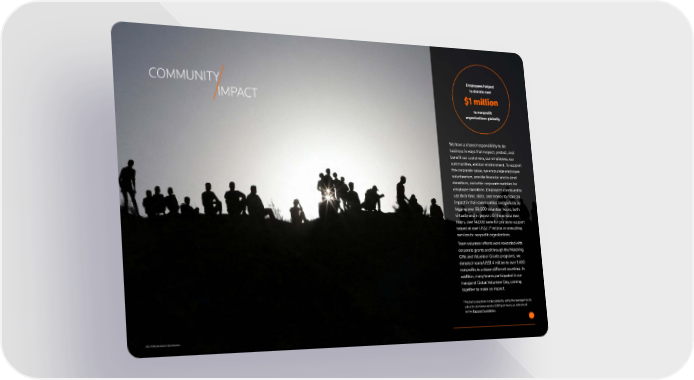 Employees helped COMMUNITY to donate over IMPACT $1 million to nonpro昀椀t organizations globally We have a shared responsibility to do business in ways that respect, protect, and bene昀椀t our customers, our employees, our communities, and our environment. To support this corporate value, we encourage employee volunteerism, provide 昀椀nancial and in-kind donations, and offer corporate matches for employee donations. Employees continued to use their time, skills, and money to make an impact in their communities and globally by logging over 68,000 volunteer hours, both virtually and in-person. Of these volunteer hours, over 14,000 were for pro bono support 3 valued at over US$2.7 million in consulting services to nonpro昀椀t organizations. Team volunteer efforts were rewarded with corporate grants and through the Matching Gifts and Volunteer Grants programs, we donated nearly US$1.4 million to over 1,400 nonpro昀椀ts in a dozen different countries. In addition, many teams participated in our inaugural Global Volunteer Day, coming together to make an impact. 3 Pro bono valuation is calculated by using the average hourly value for pro bono service ($195 per hour), as referenced by the Taproot Foundation. 23 REUTERS/Ibraheem Abu Mustafa