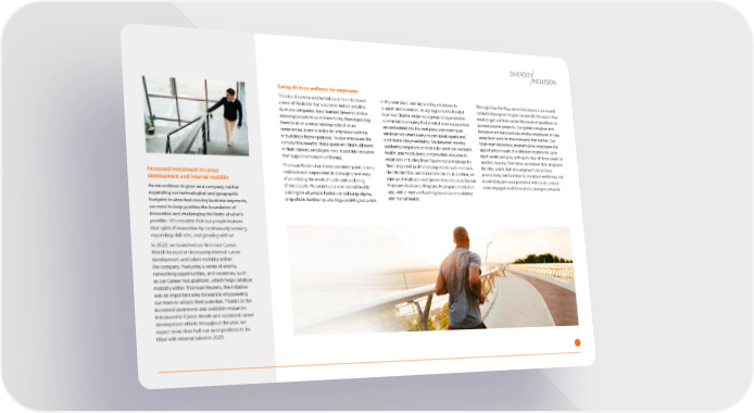 DIVERSITY INCLUSION Going all-in on wellness for employees The rise of remote and hybrid work has introduced in the workplace, and signposting employees to Through Flex My Way, we’ve introduced a six-month a level of 昀氀exibility that was never before possible. support and resources. By signing on to the Mindful sabbatical program to give our people the space they As many companies have learned, however, simply Business Charter, we joined a group of organizations need to get out from under the crush of deadlines to allowing people to work from home, then expecting committed to ensuring that mindful business practices pursue passion projects. Our global caregiver and them to sit on a never-ending cycle of video are embedded into the workplace and creating an bereavement leave policies enable employees to step conferences, is not a recipe for employee wellness environment where everyone can speak openly and away from work for the moments that matter. Our or building a higher purpose. To give employees the con昀椀dently about wellbeing. We delivered monthly Work from Anywhere program gives employees the runway they need to chase goals and 昀椀nd ful昀椀llment wellbeing campaigns on topics like gratitude, women’s opportunity to work in a different location for up to in their careers, employers need to provide resources health, and mindfulness, and provided resources to eight weeks per year, with up to four of those weeks in that support employee wellbeing. employees including Brave Spaces support groups for another country. Over time, we believe that programs Thomson Reuters has taken a leadership role among those impacted by life changing events such as cancer, like this, which shift the employer’s focus from Increased investment in career multinational corporations in leveraging new ways the Ukraine War, and Asian hate crimes. In addition, we productivity and facetime to employee wellbeing and development and internal mobility of prioritizing the mental health and wellbeing equipped employees with just-in-time resources like our maximizing personal potential, will create a much of our people. We launched a new mental health Employee Assistance Program, Headspace meditation more engaged workforce and a stronger company. As we continue to grow as a company, further training for all people leaders on reducing stigma, app, and on demand learning resources on resilience expanding our technological and geographic empathetic leadership, creating psychological safety and mental health. footprint in ultra-fast-moving business segments, we need to keep pushing the boundaries of innovation and challenging the limits of what’s possible. It’s essential that our people harness that spirit of innovation by continuously learning, expanding skill sets, and growing with us. In 2022, we launched our 昀椀rst-ever Career Month focused on increasing internal career development and talent mobility within the company. Featuring a series of events, networking opportunities, and resources, such as our Career Hub platform, which helps catalyze mobility within Thomson Reuters, the initiative was an important step forward in empowering our team to unlock their potential. Thanks to the increased awareness and available resources introduced in Career Month and sustained career development efforts throughout the year, we expect more than half our open positions to be 昀椀lled with internal talent in 2023. 2222