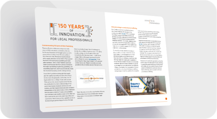 JUSTICE TRUTH TRANSPARENCY Using technology to combat human traf昀椀cking Over 12 million Ukrainians have 昀氀ed their homes online sexual services was playing a role in fueling since Russia’s February 2022 invasion of the this risk. Online demand for sex with Ukrainian country, according to UN data. With an estimated women and girls spiked by 120% to 600% in 昀椀ve million 昀氀eeing to neighboring countries and European countries as the war in Ukraine entered the another seven million believed to be displaced inside Western news cycle. Ukraine, the war has created the ideal conditions Armed with this information, we were able to form a for human traf昀椀cking. For decades, organized crime public-private partnership with OSCE to launch the syndicates have leveraged geopolitical con昀氀icts to Be Safe campaign, a joint campaign to get critical prey on vulnerable populations, using sophisticated, safety advice to Ukrainians to help them spot the transnational networks to perpetuate acts of sexual Commemorating 150 years of West Publishing exploitation and forced labor. signs of traf昀椀ckers and how to get help. It included the launch of a new ‘Be Safe’ advisory website in Thomson Reuters celebrated an important mile- More importantly, though, West’s forethought to Thomson Reuters has committed to using our English, Ukrainian, and Russian and a social media stone in 2022, not only for our business, but also develop the underlying legal taxonomy — the ability data, analytics, and subject matter expertise to campaign. The campaign was also showcased at for the very foundation of the legal system as we’ve to code, catalog, and search judicial decisions help intergovernmental organizations and law key international forums such as the United Nations, come to know it today. It was 150 years earlier, in immediately after they were made — would create enforcement agencies stop these abuses. In helping to mobilize support from policymakers, law 1872, that a St. Paul, Minnesota-based book and a legacy that is still supporting access to justice response to the war in Ukraine, we partnered with enforcement, and NGOs around the world. of昀椀ce supply salesman named John B. West opened and continued innovation 150 years later. Today, the Organization for Security and Co-operation in We are proud to work with organizations such as the the doors of his eponymous publishing and book everything from basic legal research to AI-powered Europe (OSCE) to research the demand for Ukrainian sales operation. John B. West Publisher and Book contract review and litigation analytics are made women and girls for sexual exploitation and provide OSCE to support the 昀椀ght against human traf昀椀cking. Seller would become the 昀椀rst business of its kind in possible by the annotation process West pioneered. a data snapshot to arm policymakers and diplomats. Our partnership re昀氀ects the power of public-private the region specializing in gathering, publishing, and Using our investigative tools, our analysis of internet partnerships and demonstrates Thomson Reuters’ annotating legal texts, and it would eventually create purpose by informing the way forward using our patterns found clear signals that human traf昀椀ckers teams, technology, and our people to deter and the standard taxonomy used to catalog caselaw. were preying on Ukrainians, and that the demand for prevent human traf昀椀cking. It was West’s problem-solving spirit that would give the rapidly expanding western United States its 昀椀rst taste of equal justice. At the time, the US legal system was a collage of laws and caselaw. Then, just as now, access to justice under the law was predicated on a clear understanding of how courts have treated citizens in criminal and civil matters, and that required fair access and consistent interpretation of the nation’s laws. In 1872, Minnesota had only been a state for 14 years, and published Watch this video to hear from our Westlaw Attorney court decisions took months or years to 昀椀nd their way Editors about how these editorial enhancements from courts in the east to the state’s law of昀椀ces and courtrooms. West’s focus on fast, equitable access to help conduct more accurate and ef昀椀cient legal the latest legal opinions helped to close that gap. research. 10