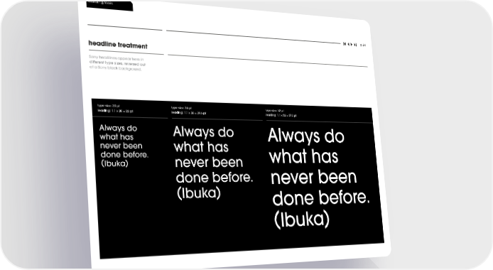 building tools p. 24 headline treatment Sony headlines appear here in diļ¬erent type sizes, reversed out of a Sony black background. type size: 20 pt type size: 36 pt type size: 52 pt leading: 1.1 x 20 = 22 pt leading: 1.1 x 36 = 39.6 pt leading: 1.1 x 52 = 57.2 pt Always do Always do what has Always do never been what has done before. what has ( ) Ibuka never been done before. never been ( ) Ibuka done before. ( ) Ibuka