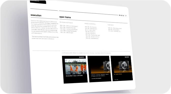 environments p. 91 execution open frame Sony’s online retail presence is a vital piece Rectangle and Popups Banners and Buttons Skyscrapers of our communication strategy. Exceptions to ( ) ( ) ( ) the visual guidelines are made to accomo- 300 x 250 - Medium Rectangle 468 x 60 - Full Banner 160 x 600 - Wide Skyscraper ( ( ) ( ) date the restrictions presented by the web. 250 x 250 - Square Pop-Up) 234 x 60 - Half Banner 120 x 600 - Skyscraper ( ) ( ) ( ) While all the foundational elements must be 240 x 400 - Vertical Rectangle 88 x 31 - Micro Bar 300 x 600 - Half Page Ad ( ) ( ) included, their shape, size and relationship 336 x 280 - Large Rectangle 120 x 90 - Button 1 ( ) ( ) to one another are slightly different form the 180 x 150 - Rectangle 120 x 60 - Button 2 ( ) print executions. 120 x 240 - Vertical Banner 125 x 125 - (Square Button) ( ) The most common formats and solutions are 728 x 90 - Leaderboard presented here as a quick reference. square pop-up (250 x 250 pixels) a possible sequence in three steps, shown here at 80% of the actual size. Animated copy runs here. Uptat exer sed mod min ulluptatem. Luptatue Learn more. ea feugue molore dolor odolobor. www.sony.com⁄cybershot