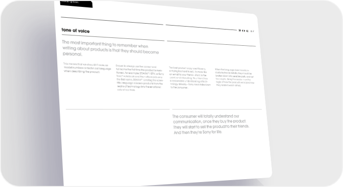 building tools p. 31 tone of voice The most important thing to remember when writing about products is that they should become personal. This means that we shouldn’t overuse Ensure to always use the correct and The best product copy is not flowery, When the language does have to in- model numbers or technical language full name the first time the product is men- or trying too hard to sell. It’s more like clude technical details, they should be when describing the product. tioned, for example: BRAVIATM HDTV, or Sony an email to your friend – short, to the broken down into sensible parts, and not ® Vaio notebook and then afterwards only point, and interesting. Your friend has too cryptic. Bring the reader in on the TM the first name, BRAVIA . Limiting the scien- a reasonable understanding of tech- logic of how the products work (and how tific language releases products from the nology already – Sony never talks down they relate to each other). realm of technology into the emotional to the consumer. side of our lives. The consumer will totally understand our communication, once they buy the product. They will start to sell the product to their friends. And then they’re Sony for life.