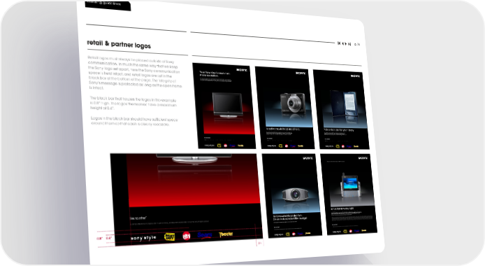 building guidelines p. 74 retail & partner logos ����������������������������� ����������������� Retail logos must always be placed outside of Sony ������������������������������������������������������������������������������������������������� communication. In much the same way that we keep ����������������������������������������������������������������������������������������������������� ���������������������������������������������������������������������������������������������� the Sony logo set apart, here the Sony communication ����������������������������� ����������������� space is held intact, and retail logos are set in the ������������������������������������������������������������������������������������������������� ����������������������������������������������������������������������������������������������������� black bar at the bottom of the page. The integrity of ���������������������������������������������������������������������������������������������� Sony’s message is protected as long as the open frame is intact. The black bar that houses the logos in this example is 0.8” high. The logos themselves have a maximum height of 0.4”. Logos in the black bar should have sufficient space around them so that each is clearly readable. ������������������������������� ���������������������������������� � ������������������������������������������������������������������������� �������������������������������������������������������������������������������������� �������������������������������������������������������������������������������������� ����������������������������������������������������������������������� �� �������������������������������������������������������������������������������� ����������������������������������������������������������������������������� ���� ������������������������������������������������ ������������������������������������������������������������������������ ������������������������������������������������������������������������������������������������������������������������������������ ������������������������������������������������������������������������������������������������������������������������������������ ������������������������������������������������������������������������������������������������������������������������������������ ���������������������������������������� ���������������