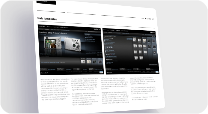 environments p. 95 web templates Web templates are also a unique form The logo should always where possible The Avante Garde typeface should be pages, the type should be set in black of Sony communication that needs be placed on the right side of the up- used whenever possible, for example on a white background. In e-commerce, special attention. As the open frame per black bar just as in print materials. with Flash or other graphical text elements. product listings, products can be presented will not work in all browsers, the In HTML pages, where the logo might For HTML text, a sans serif font such as the against a white background. requirement for its use is by using it be cropped by the user’s screen, the Arial or Helvetica combination should be only at the top and bottom (in es- logo may be placed on the left. substituted. In the merchandising and advertising lay- sence a frame open on both sides). outs, the product treatment should support These bars at the top and bottom are For readability, text-heavy pages The pages should always keep a black the color glow, and reflection guidelines necessary to house and distinguish should not have white text reversed out background when used for merchandis- outlined by Sony print work. the Sony logo and Sony tagline. of a black background. For ing and advertising purposes. Link/button example, dense online learning text color should match or complement For consistency, web pages should optimize articles should be treated with black the color of the glow and otherwise must for 1024 x 768 screen size. text on a white background. remain white. Once again, on text-heavy