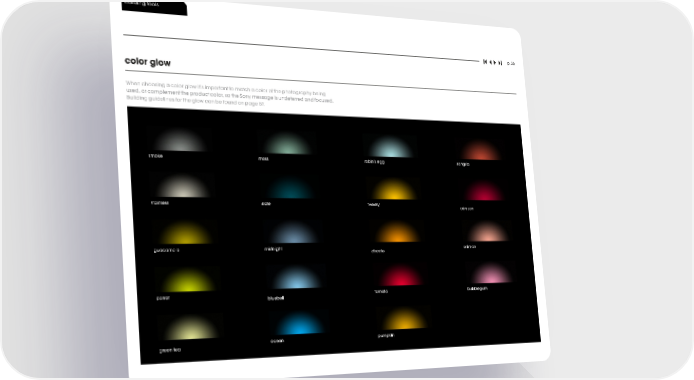 building tools p. 36 color glow When choosing a color glow it’s important to match a color of the photography being used, or complement the product color, so the Sony message is undeterred and focused. Building guidelines for the glow can be found on page 57. smoke moss robin’s egg sangria stainless slate tweety crimson guacamole midnight cheeto salmon parrot bluebell tomato bubblegum green tea ocean pumpkin