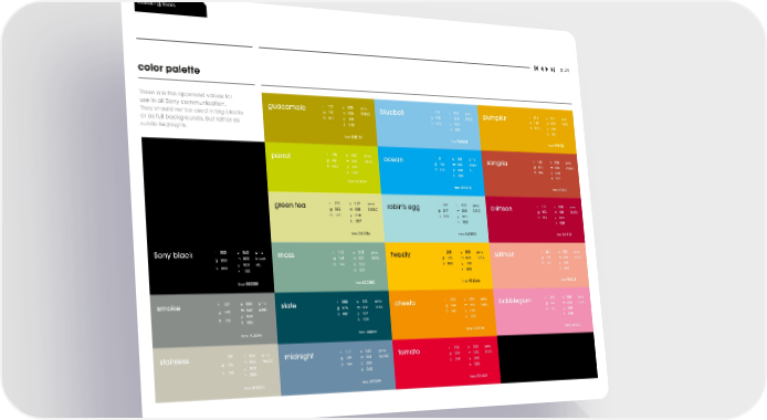 building tools p. 34 color palette These are the approved values for use in all Sony communication. guacamole r 171 c 000 pms bluebell r 151 c 050 pms pumpkin r 216 c 011 pms They should not be used in big blocks g 157 m 005 3985C g 195 m 010 292C g 168 m 049 131C b 013 y 100 b 230 y 000 b 015 y 095 or as full backgrounds, but rather as k 040 k 000 k 001 subtle highlights. hex B1B134 hex 96B8DB hex DF8F2D parrot r 198 c 032 pms ocean r 0 c 100 pms sangria r 163 c 000 pms g 207 m 000 381C g 164 m 000 cyan g 073 m 055 7524C b 033 y 100 b 232 y 000 C b 054 y 060 k 000 k 000 k 027 hex BBD634 hex 00A4E8 hex B24F3F green tea r 221 c 012 pms robin’s egg r 182 c 038 pms crimson r 152 c 000 pms g 222 m 000 7492C g 217 m 000 318C g 002 m 100 7427C b 148 y 050 b 220 y 015 b 052 y 065 k 007 k 000 k 028 hex DBE3B6 hex A4DBDB hex B51F29 Sony black r 000 c 060 pms moss r 140 c 042 pms tweety r 238 c 000 pms salmon r 224 c 000 pms g 000 m 050 black g 168 m 000 557C g 193 m 025 123C g 163 m 045 177C b 000 y 020 6C b 149 y 033 b 000 y 100 b 143 y 040 k 100 k 027 k 000 k 000 hex 000000 hex B2C8BD hex FDD666 hex F58268 r 137 c 050 pms r 000 c 100 pms smoke slate pms cheeto r 220 c 000 pms bubblegum r 218 c 000 pms g 140 m 040 430C g 076 m 000 316C g 144 m 050 144C g 143 m 055 211C b 136 y 040 b 087 y 027 b 024 y 100 b 175 y 008 k 005 k 068 k 000 k 000 hex 7C8285 hex 165B65 hex DC9018 hex F4979C stainless r 199 c 025 pms midnight r 117 c 042 pms tomato r 194 c 000 pms g 196 m 020 7543C g 139 m 008 5415C g 000 m 100 186C b 180 y 030 b 164 y 000 b 049 y 080 k 000 k 040 k 000 hex BFBDB0 hex 697D99 hex E31A22