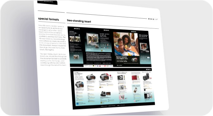 building guidelines p. 71 special formats free-standing insert Sony FSI communication gives us an opportunity to reinforce our � message in yet another brand ����������� �������� �� ��������������������� ������������������ ��������������������� ��������������� ������������������ ��������������� �������������������� touch point of the consumer’s �������������� �������������������� ����������������� �������������� ����������������� � � � � ����������� ��������� ����������������� ���������������� ����������� ��������� ����������������� ���������������� ���������������� ���������������� ��������������������������������������������� journey. It must be focused, iconic, ��������������������������������������������� ��������������������� ��������������������� ��������������������������������������������������� ��������������������������������������������������� � � ���������� ����������������������������������������� ���������� ����������������������������������������� ��������������������������������������������������� confident, and truly from Sony. The ��������������������������������������������������� � ������������������������������ ������������������������� ���� �� �� ���������� ���������� ������������������������������������ FSI must follow our brand strategy �������������������������������������������������������������������������������������������� � � ������������������������������������������������������������ ������������������������������������������������ ������������������������������������������������������������������������������������ ���������������������� ������������������� ������������������������������������������������������������������������������������������������������ ���������������������� ������������������� and adhere as closely as possible �������������������������������������������������������������������������������������������������������������� ������������������ ���� ������ ������������������ ���������������������������������������������� �� ��������������������������������������������� ���������� ��������������������������������������������� ������ ������������������������������������������������������� ���������������������������������������������� ������ to the design standards outlined in �������������������������������