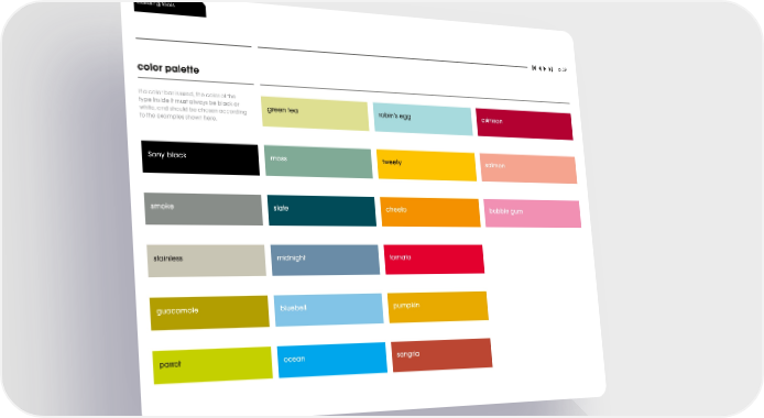 building tools p. 39 color palette If a color bar is used, the color of the type inside it must always be black or green tea robin’s egg crimson white, and should be chosen according to the examples shown here. Sony black moss tweety salmon smoke slate cheeto bubble gum stainless midnight tomato guacamole bluebell pumpkin parrot ocean sangria