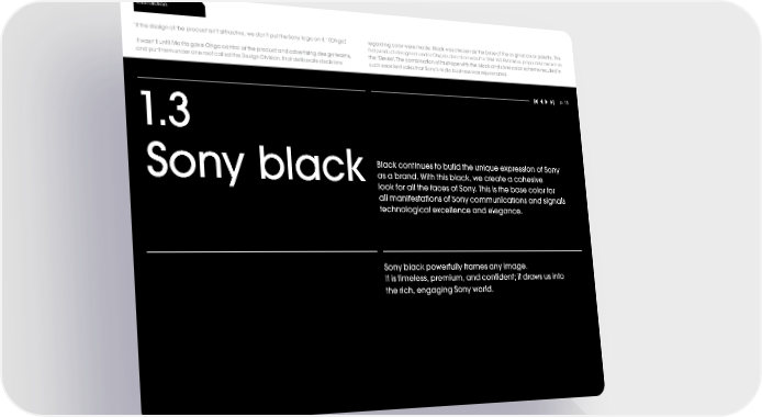 foundation ( ) “If the design of the product isn’t attractive, we don’t put the Sony logo on it.” Ohga regarding color were made. Black was chosen as the base of the original color palette. The first product designed under Ohga’s direction was the TFM-110 FM radio, popularly known as It wasn’t until Morita gave Ohga control of the product and advertising design teams, the ‘Eleven’. The combination of its shape with the black and silver color scheme resulted in and put them under one roof called the Design Division, that deliberate decisions such excellent sales that Sony’s radio business was rejuvenated. 1.3 p. 15 Black continues to build the unique expression of Sony Sony black as a brand. With this black, we create a cohesive look for all the faces of Sony. This is the base color for all manifestations of Sony communications and signals technological excellence and elegance. Sony black powerfully frames any image. It is timeless, premium, and confident; it draws us into the rich, engaging Sony world.