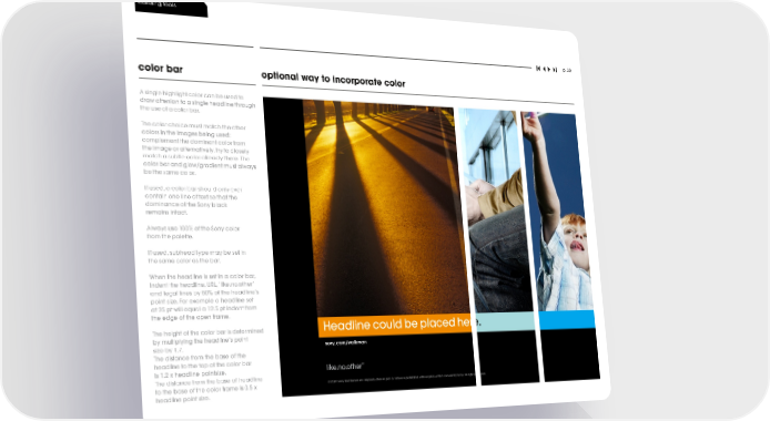 building tools p. 38 color bar optional way to incorporate color A single highlight color can be used to draw attenion to a single headline through the use of a color bar. The color choice must match the other colors in the images being used; complement the dominant color from the image or alternatively, try to closely match a subtle color already there. The color bar and glow/gradient must always be the same color. If used, a color bar should only ever contain one line of text so that the dominance of the Sony black remains intact. Always use 100% of the Sony color from the palette. If used, subhead type may be set in the same color as the bar. When the headline is set in a color bar, indent the headline, URL, ‘like.no.other’ and legal lines by 50% of the headline’s point size. For example a headline set at 25 pt will equal a 12.5 pt indent from . the edge of the open frame ������������������������������� The height of the color bar is determined �������������������������������������������������������������� by multiplying the headline’s point size by 1.7. ����������������������������� ����������������� The distance from the base of the headline to the top of the color bar is 1.2 x headline pointsize. The distance from the base of headline to the base of the color frame is 0.5 x ������������������������������������������������������������������������������������������������������������������������������������������������������������������������������������������������������������������������������������������������������������������������������������������������������������������������������������������������������������������������������������������������������������ headline point size.