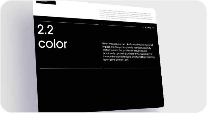 building tools Sony’s new color television model was tested in October 1967. After years of intense labor and many sleepless nights, we stood back and watched as the incredibly bright screen overflowed with dynamic color. Everyone could only stare at the screen in silent amazement as Ibuka and top directors arrived breathless in the lab from running through the building. The new Sony® Trinitron® TV had been born. 2.2 p. 33 When we use color, we aim for maximum emotional color impact. The Sony color palette has been carefully crafted to carry this emotional robustness into functionally appealing design. Bringing color into the world and enriching our emotional lives has long been at the core of Sony.