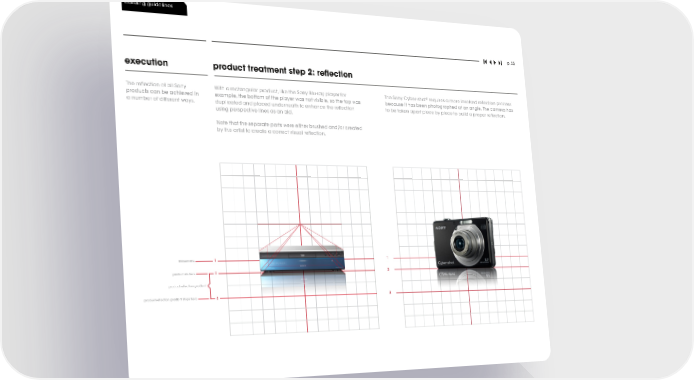 building guidelines p. 55 execution product treatment step 2: reflection The reflection of all Sony With a rectangular product, like the Sony Blu-ray player for The Sony Cyber-shot® requires a more involved reflection process products can be achieved in example, the bottom of the player was not visible, so the top was because it has been photographed at an angle. The camera has a number of different ways. duplicated and placed underneath to enhance the reflection to be taken apart piece by piece to build a proper reflection. using perspective lines as an aid. Note that the separate parts were either brushed and/or created by the artist to create a correct visual reflection. horizon line 1 1 product sits here 2 2 product reflection gradient product reflection gradient stops here 3 3