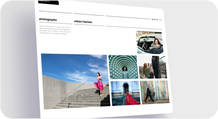 building tools p. 44 photography urban/fashion Urban and fashion images should have good composition and color. They are dramatic and should focus the viewer on the precision and quality of details.