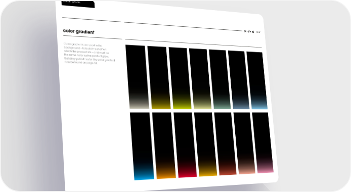 building tools p. 37 color gradient Color gradients are used in the background – to build the shelf on which the product sits – and must be the same color as the product glow. Building guidelines for the color gradient can be found on page 58.