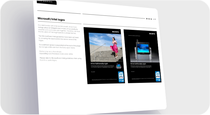 building guidelines p. 75 Microsoft/Intel logos Our relationship with Intel and Microsoft, whose tech- nology plays an integral role in many of our products, requires us to communicate together. Therefore, we treat the inclusion of their logotypes in a unique fashion. ���������������������������������������� ���������������������������������������� The Microsoft and Intel guidelines have been adhered to, ensuring the appropriate free space around the logos. Our partners’ space is separated at the foot of the page by a single white rule from the Sony open frame. Partnership area: Sony black Seperating rule: thickness: 0.5pt, color: white Please refer to Microsoft and Intel guidelines when using their third-party logos. ������������������������� ������������������������� � � � � � � ���������������������������������������������������������������������������������������� ���������������������� ���������������������������������������������������������������������������������������� ���������������������� ������������������������������������������������������������������������������������������������������������������� ������������������������������������������������������������������������������������������������������������������� ��� � ��� � ��������������������������������������� ����������������������������� ������������������������������������������������� ��������������������������������������� ����������������������������� ������������������������������������������������� �������������������������������������������������������������������������������������������������������������� �������������������������������������������������������������������������������������������������������������� ����������������������������������������������������������������������������������������������������������������������������������������������������������������������������������� ����������������������������������������������������������������������������������������������������������������������������������������������������������������������������������� ��������������������������������������������������������������������������������������������������������������������������������������������������������������������������������� ��������������������������������������������������������������������������������������������������������������������������������������������������������������������������������� �������������