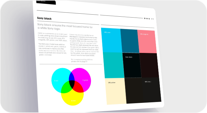 foundation p. 16 Sony black Sony black ensures the most focused home for a white Sony logo. 60% cyan 50% magenta CMYK is a subtractive color model used Colors may also be specified as an in color printing. Sony black is built from RGB triplet in hexadecimal format (a hex the following values: 60% cyan, 50% triplet); this six-digit alphanumeric code magenta, 20% yellow, and 100% black. is used in HTML and CSS, and other com- puting applications, to represent color. The RGB color model is an additive The first two digits represent the red value, model in which red, green, and blue the second two represent the green value, are combined to reproduce other and the last two represent the blue value. colors used on screen. The deepest Over 16 million colors can be represented black is built from zero values for red, by this system. Sony black on screen green, and blue. should have the hex triplet 000000. Sony black For newspaper print guidelines, please refer to page 67. 0 red 0 green 20% yellow 100% black 0 blue