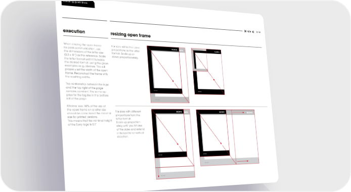 building guidelines p. 52 execution resizing open frame When resizing the open frame For sizes within the same for print communication, use proportions as the letter the dimensions of the letter size format. Scale up or (8.5 x 11”) as the reference. Scale down proportionately. the letter format until it fits inside the desired format, using the given examples as guidelines. This will properly set the width of the open frame. Reconstruct the frame with the resulting widths. The relationship between the logo and the top right of the page remains constant. The same ap- plies for the tagline in the bottom left of the page. Minimal size: 50% of the size of the open frame on a letter size For sizes with different should be considered the minimal proportions from the size for printed versions. letter format. This means that the minimal height Scale up proportion- of the Sony logo is 0.1” ately until you hit one of the sides and extend in horizontal or vertical direction.