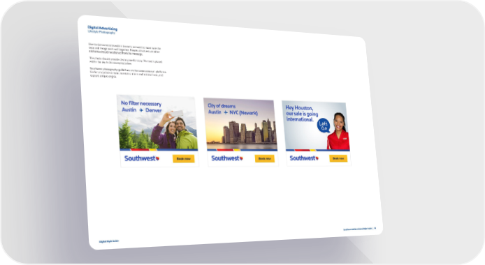 Digital Advertising Lifestyle Photography Due to size constraints within banners, we want to make sure the copy and image work well together. People, structures, or other elements should not distract from the message. The photo should provide clean space for copy. The text is placed within the sky in the examples below. Southwest photography guidelines are the same across all platforms. Go for an optimistic tone, maintain a clean and minimal look, and capture unique angles. Digital Style Guide Southwest Airlines Brand Style Guide | 78