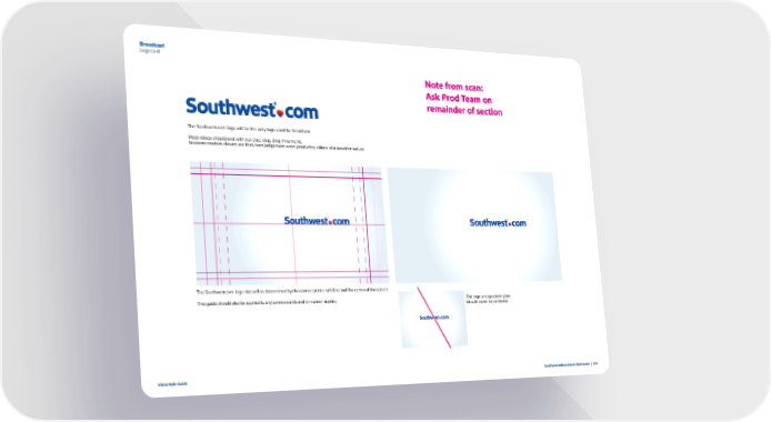 Broadcast Logo card Note from scan: Ask Prod Team on remainder of section The Southwest.com logo will be the only logo used for broadcast. Most videos should end with our clap, clap, ding mnemonic, however creators should use their best judgement when producing videos of a sensitive nature. The Southwest.com logo size will be determined by the center cut title safe line and the center of the screen. This guide should also be applied to any camera cards and on-screen supers. The logo and gradient glow should never be centered. Video Style Guide Southwest Airlines Brand Style Guide | 142