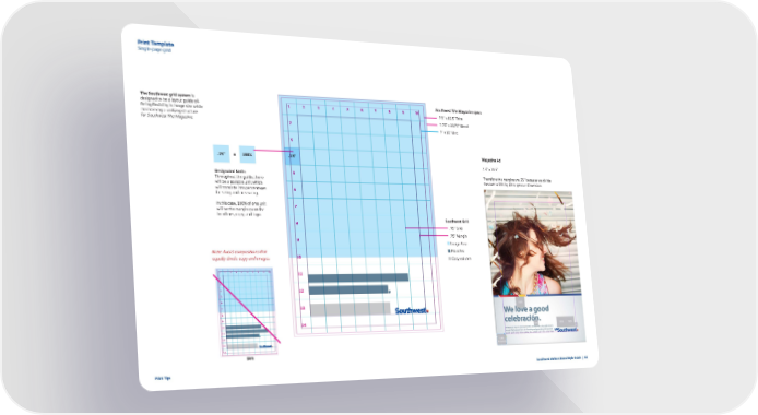 Print Template Single-page grid The Southwest grid system is Southwest The Magazine specs designed to be a layout guide of- 1 2 3 4 5 6 7 8 9 10 fering flexibility in image size while 7.5” x 10.5” Trim maintaining a unifying structure 7.75” x 10.75” Bleed for Southwest The Magazine. 2 7” x 10” Live 3 .75” = 100% .75” Magazine Ad 7.5” x 10.5” Designated Units 5 Therefore the margins are .75” because we divide Throughout the guide, there the over width by 10 to get our dimension. will be a scalable unit which will translate into percentages 6 for sizing and measuring. In this case, 100% of one unit 7 will be the margin space for headlines, copy, and logo. 8 Southwest Grid .75” Grid .75” Margin 9 Image Area Note: Avoid compositions that Headline equally divide copy and images. 10 Copy column 1 2 3 4 5 6 7 8 9 10 11 2 3 4 12 5 6 7 13 8 9 10 14 11 12 13 14 50% Print Tips Southwest Airlines Brand Style Guide | 62
