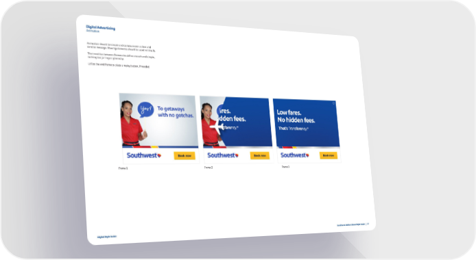 Digital Advertising Animation Animation should be simple and communicate a clear and concise message. Moving elements should be used minimally. The transition between frames should be smooth and simple, nothing too jarring or gimmicky. Utilize the end frame to place a replay button, if needed. Frame 1 Frame 2 Frame 3 Digital Style Guide Southwest Airlines Brand Style Guide | 77