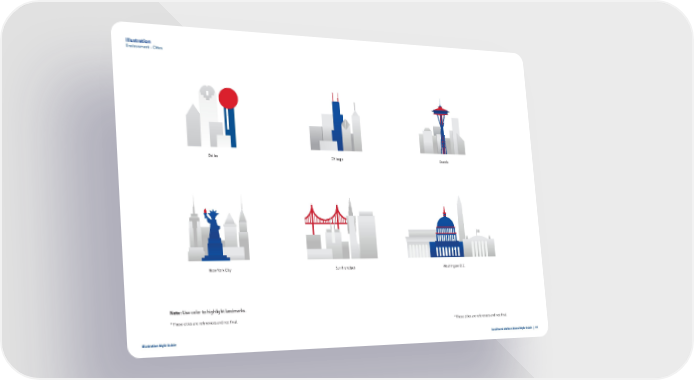 Illustration Environment - Cities Dallas Chicago Seattle New York City San Francisco Washington D.C. Note: Use color to highlight landmarks. * These cities are references and not final. * These cities are references and not final. Illustration Style Guide Southwest Airlines Brand Style Guide | 44