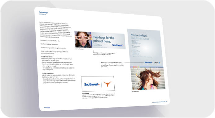 Partnerships Logo styling Just for reference the following style will be how we proceed with messaging as it pertains to sponsorship, partnerships, etc in advertising. In partnership logo lock- ups, the Southwest logo should have the position of prominence on the left unless otherwise approved by the Brand Team. Sentence case will also be the method of closing the copy out excluding names of mentioned partners. As many of our frequent ad requestors/teams we wanted to provide the new styling. Southwest is the official airline of …. Southwest is proud to sponsor…. Southwest congratulates tonight’s recipients… Digital Placement Make sure to follow all logo spacing guidelines in Partner logo should be placed in the negative space in partnership advertising. one-color using the Southwest color palette. Digital Placements: • Weave the partner logo into the live area of the image, but only in the negative space. • Ask the partner to provide a one-color version of their The placement of logos should follow the placement of logo in our color palette (white on darker images, deep advertising anchoring on the bottom right. The height of silver on lighter images). the Southwest heart should be proportionate to the height of the Brand Bar. • If the artwork has a brand bar and text section, include the logo in deep silver. Offline placements: We will follow the same standards that we have already set forth for co-op advertising: • Utilize Southwest brand bar creative with partner logos in deep silver. The logo height of the partner logo should be proportional to the logo height of Southwest. Logo Styling: Print Placement Logos are to be separated by a thin weighted line in Deep Silver. The line weight should not exceed 0.5. The distance from logo to line should be equal on both sides. Logos should be proportionate to each other in height. Partnerships Southwest Airlines Brand Style Guide | 89