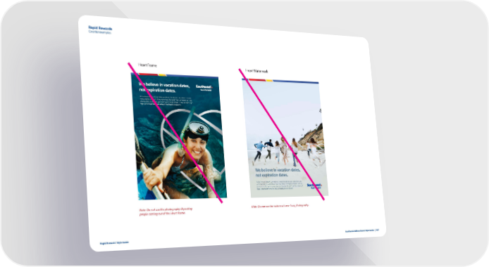 Rapid Rewards Counterexamples Heart Frame Heart Watermark We believe in vacation dates, not expiration dates. At Southwest Airlines®, we think you should be able to use points how you want, anytime you want. If you have Rapid Rewards® flight or Partner earning activity within 24 months, your points won’t expire. Period. That’s Transfarency.® Sign up for Rapid Rewards today at Southwest.com/enroll. We believe in vacation dates, not expiration dates. At Southwest Airlines®, we think you should be able to use points how you want, anytime you want. If you have Rapid Rewards® flight or Partner earning activity within 24 months, your points won’t expire. Period. That’s Transfarency.® Sign up for Rapid Rewards today at Southwest.com/enroll. Note: Do not use the photography depecting Note: Do not use the watermark over busy photography. people coming out of the Heart Frame. ® Rapid Rewards Style Guide Southwest Airlines Brand Style Guide | 107