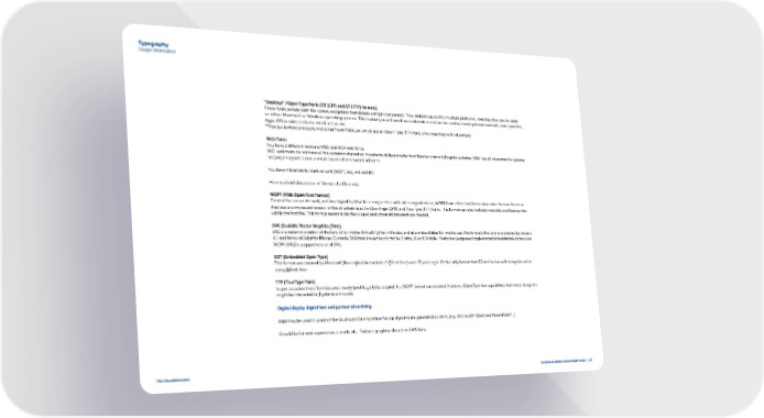 Typography Usage Information “Desktop” / Open Type Fonts (OT (CFF) and OT (TTF) formats) These fonts contain both the screen and printer font data in a single component. They include support for multiple platforms, meaning they can be used on either Macintosh or Windows operating systems. This is what you will install on workstations and can be used to create printed materials, static graphics, Apps, Office suite products, email, and so on. **For use in Word products, including PowerPoint, you must use an Open Type (TTF) font, otherwise they will not embed. Web Fonts You have 2 different versions: W01 and W04 web fonts. W01 web fonts do not have all the accented characters in order to deliver smaller font files for primarily English websites. W04 has all characters for greater language support, but as a result can result in slower load times. You have 4 formats for each as well (WOFF, svg, eot and ttf). Here is a brief description of the web font formats: WOFF (Web Open Font Format) Created for use on the web, and developed by Mozilla in conjunction with other organizations, WOFF fonts often load faster than other formats because they use a compressed version of the structure used by OpenType (OTF) and TrueType (TTF) fonts. This format can also include metadata and license info within the font file. This format seems to be the winner and where all browsers are headed. SVG (Scalable Vector Graphics (Font) SVG is a vector re-creation of the font, which makes it much lighter in file size, and also makes it ideal for mobile use. This format is the only one allowed by version 4.1 and below of Safari for iPhone. Currently SVG fonts are not supported by Firefox, IE or IE Mobile. Firefox has postponed implementation indefinitely to focus on WOFF. SVGZ is a zipped version of SVG. EOT (Embedded Open Type) This format was created by Microsoft (the original innovators of @font-face) over 15 years ago. It’s the only format that IE8 and below will recognize when using @font-face. TTF (TrueType Font) In part because these formats could easily (and illegally) be copied, the WOFF format was created. However, OpenType has capabilities that many designers might be interested in (ligatures and such). Digital display digital font and partner advertising Arial may be used in place of the Southwest Sans typeface for any dynamically generated content. (e.g., Microsoft® Word and PowerPoint®…) Should be for web experience, e-mails, etc. Paid and graphics should be SWA Sans. The Visual Elements Southwest Airlines Brand Style Guide | 33