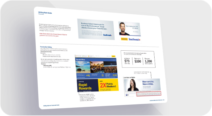 Writing Style Guide Overview ® Business Select means you’re The Writing Style Guide is the spiritual successor of Colleen’s one of the first ones on. So go Bible, a collection of spellings, grammar rules, and capitalizations, ahead, choose your favorite seat. used to maintain constancy among all of the written communica- tion for Southwest. Use this document when crafting any written But priority boarding (A1–A15) isn’t your only perk on Business Select. You’ve also got Fly By® ® security lane access. tra apid eards oints. Fully reundable message–internal or external. tickets. Free sa€e‚day flig„t c„anges. re€iu€ drink on day o travel. Yes… our Business Select perks are built around your s€ile. And you don’t „ave to be on a business trip to en†oy t„e€. Start s€iling at sout„est.co€‡getbusinessselect. Note: Please refer to the Chicago Manual of Style for guidelines not covered in this guide. ˆ„ere available Punctuation Styling Use punctuation in headlines with complete sentences and headlines that use a combination of complete and Do not use punctuation when setting off special offers incomplete sentences. with point, dollar or discount percentages. Examples: • Without a heart, it’s just a machine. • 8 days only! All destinations on sale. as low as Save up to Plus earn Do not use punctuation in headlines when stating a short, incomplete phrase (5 words or less) that has a complete $73 $200 1,200 sentence as a supporting subhead. one-way bonus points Example: • Save up to 50% (subhead) Need a quick getaway? Book your flight now. Use punctuation in online body copy that is multiple sentences long. Do not use periods in online headline copy that is not on an image, unless separating two thoughts. Use question marks or exclamations, if appropriate. Writing Style and Trademark Guide Southwest Airlines Brand Style Guide | 115