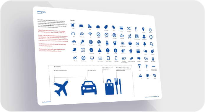 Iconography Overview Overview Use only these approved icons to ensure consistency across channels. If you need an icon that hasn’t been created yet, follow the guidelines on this page and work with the Brand Identity team to ensure the look of your new icon conforms to this style guide. Flight Car Hotel Vacation Special offers Retail Credit card Points transfer Dining Destination Travel time Note: All icons must appear flat and two-dimensional. Do not add perspective, color gradients, or 3-D effects. Graphic icons are only used to visually clarify messages for Stops Change planes WiFi Check-In Flight status Change flight Where we fly Map search Date/Search/Calendar Passenger/Profile Time our Customers. They are predominantly used in digital, where the icons aid in site navigation. These icons are not to be used in the same manner as emoticons or wingdings. Use these icons only for their intended and approved Vehicle size Rental company Language Contact Security Extras Add EarlyBird Check-In Print Share Alert Search communication purposes. Preference blue, must be in color palette otherwise. Icon creation vetted through Brand Identity. External link Mobile apps Added/Success Error Advisory Tooltip Shop and dine Home Movies Messaging NFL Redzone Permitted Never Permitted TV Laptop Computers Tablets or E-Readers Smart Phones Television or Remote-Controlled Toys Pacemakers Hearing Aids Two-way Radios AM/FM Radio Receivers Characteristics Add space to give the icon a Make icons simple, but be sure there’s unique personality. enough detail for people to easily identify Electronic Cigarettes Mix sharp and rounded edges. Use a straight-on view. what the icon represents. Nightlife Golf and Smoking Devices Ski Family Vacations The Visual Elements Southwest Airlines Brand Style Guide | 34